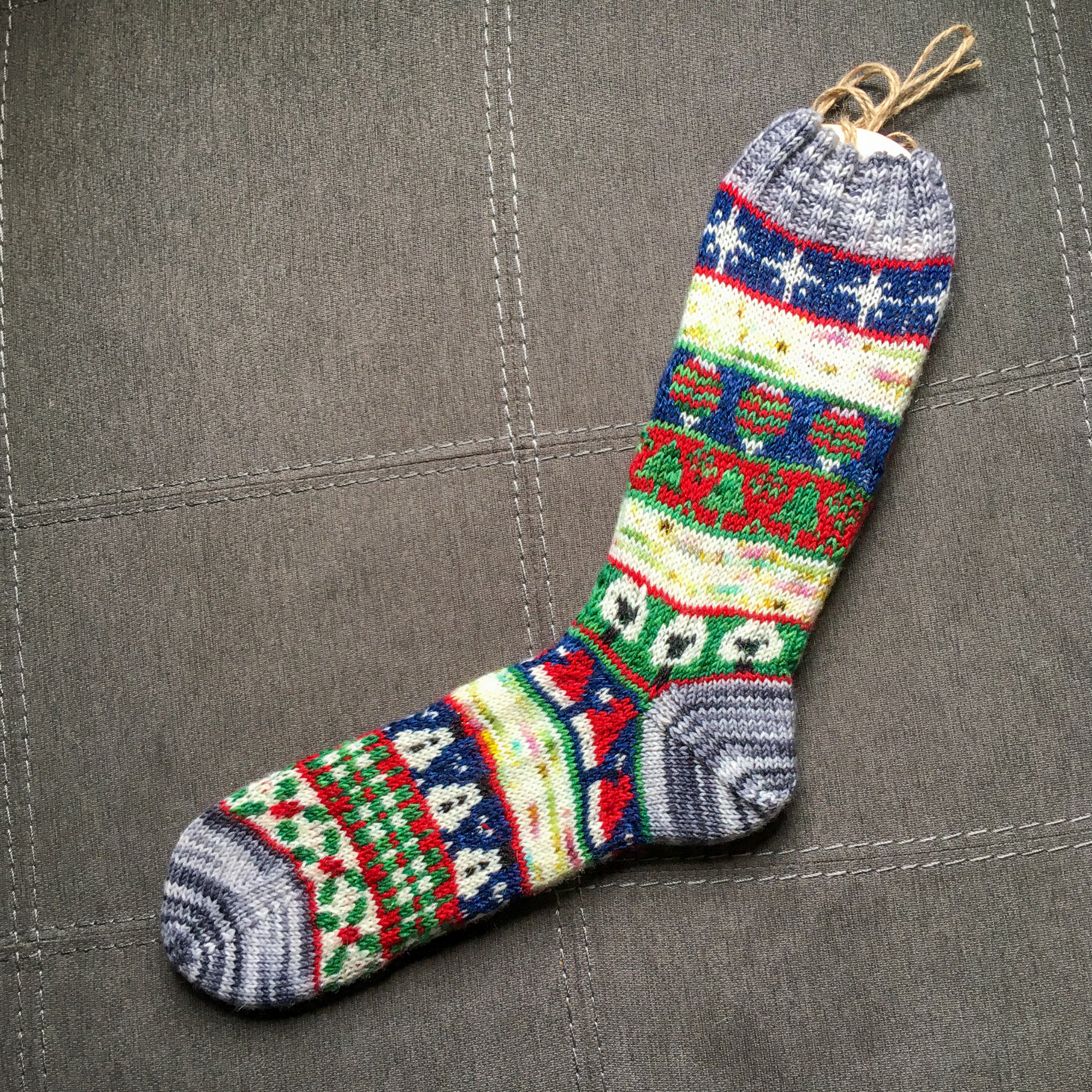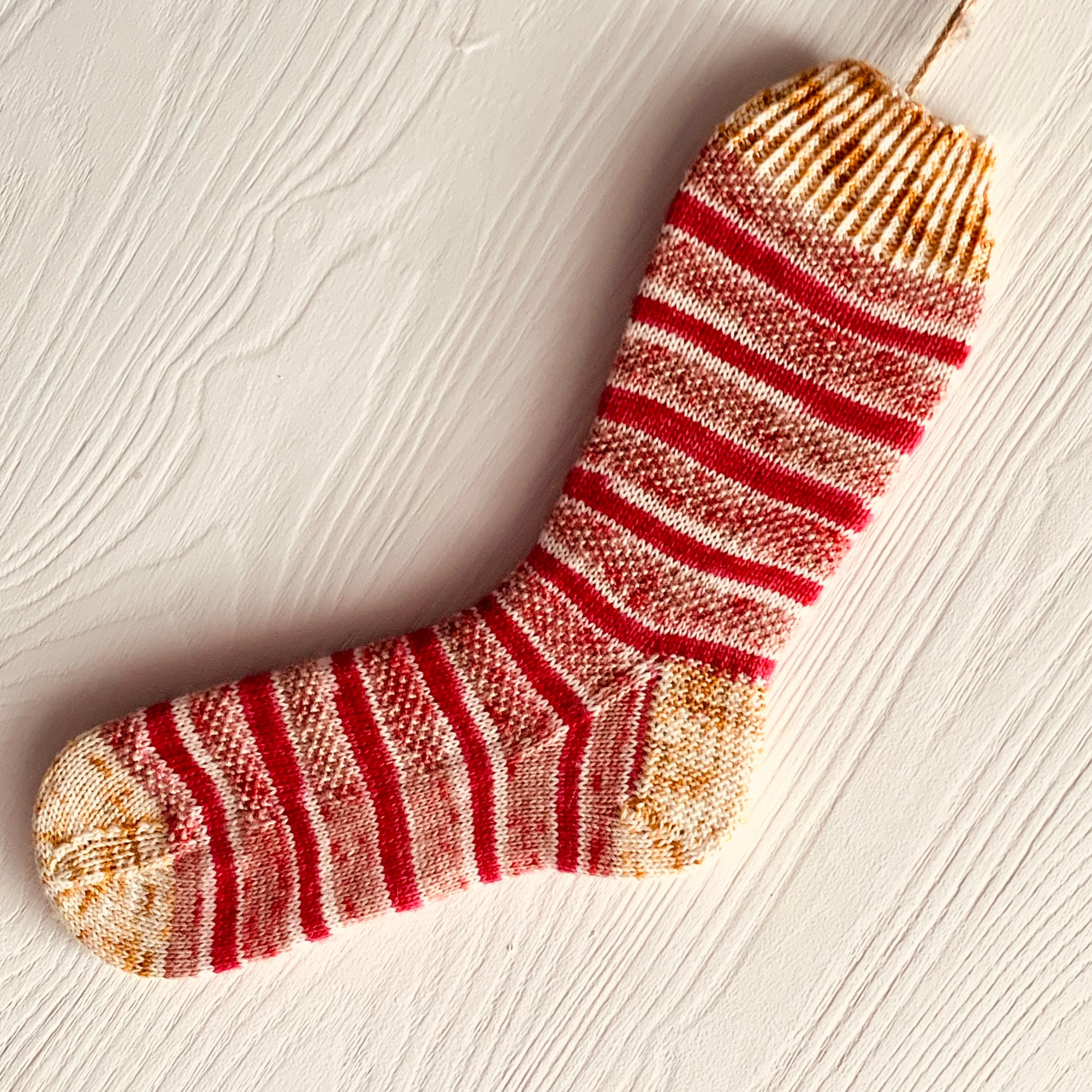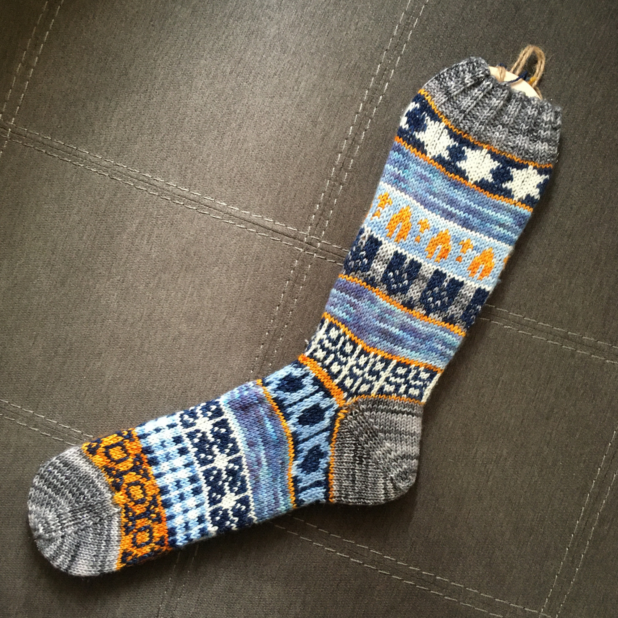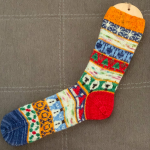 Celebrating the 8 nights of Chanukkah, this sock was inspired by the menorah sitting on a table with the Star of David above and all the gifts, gelt, and dreidels on the table beneath. A beautiful time of family and togetherness can only be made better by a few pairs of these!