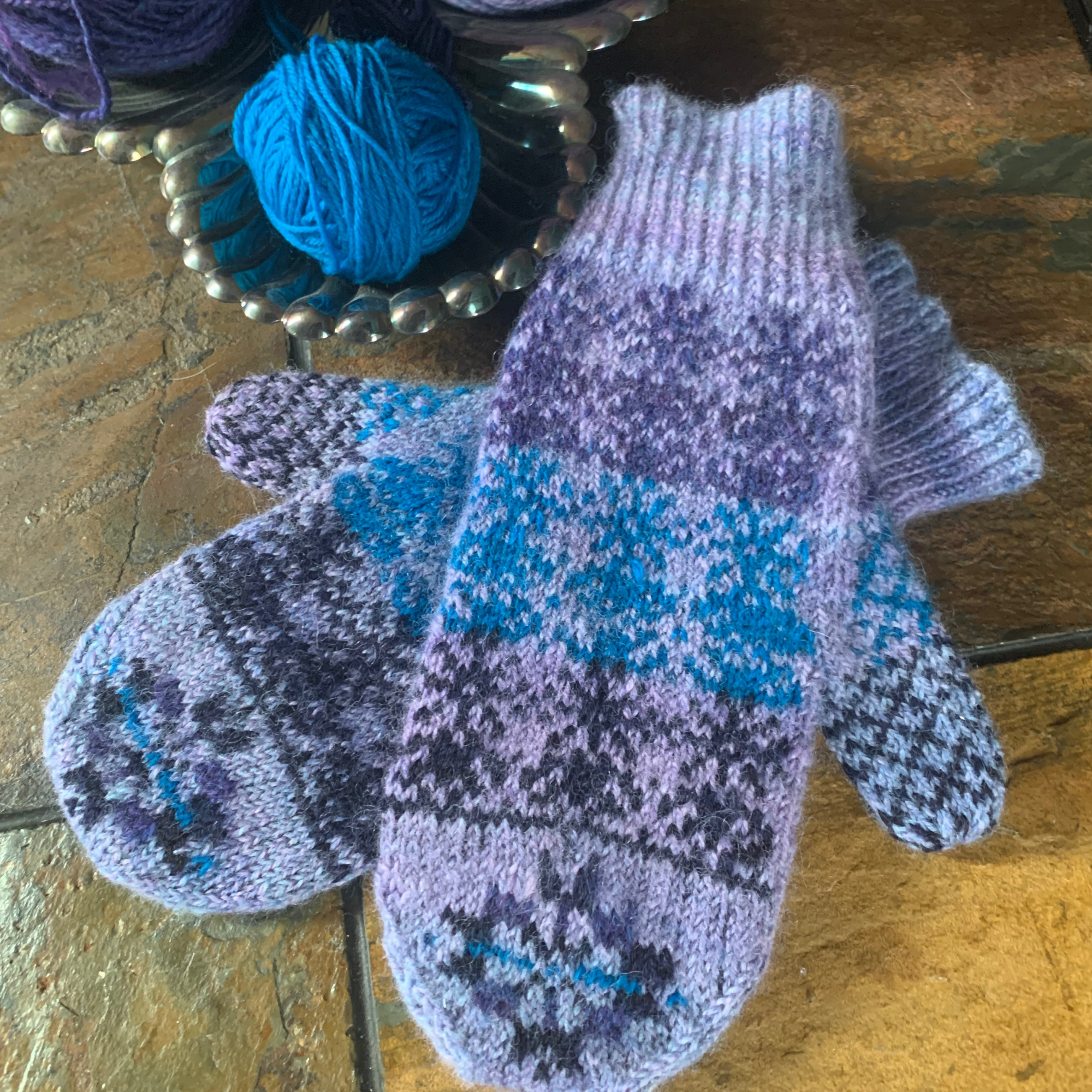 Welcome the anticipated snow with the dancing snowflakes on these mittens! They are perfect for mini skeins or stash busting and are complete with a little heart in the palm of each pair!